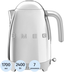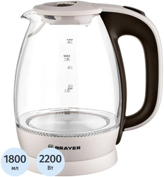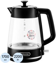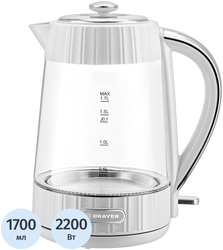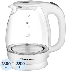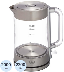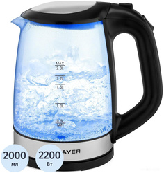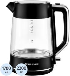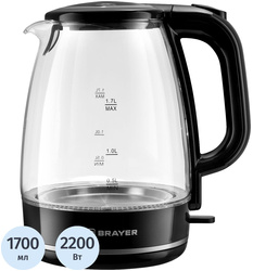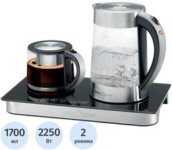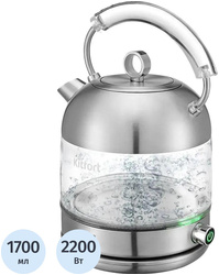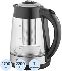 1,7 л, 2200 Вт, закрытый нагревательный элемент, терморегулятор, заварник, стекло, серебро