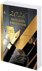 Блок календаря на 2026 год напечатан на офсетной бумаге плотностью 60 г/м2 в две краски с выделением цветом выходных и праздничных дней. Справочная информация на 320 листах: календарь на текущий месяц, часы восхода и захода солнца, долгота дня, лунный календарь, информация о государственных, профессиональных, международных и религиозных праздниках. Главной особенностью является увеличенное количество листов, для каждого дня отведена не одна страница, а две (полный разворот). На странице справа размещена календарная сетка текущего квартала.