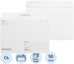 Конверты с отрывной полосой КОМУС, C4 (229×324 мм), белые, 100г/м², прямой клапан, 50 шт/уп