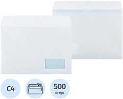 Конверты с отрывной полосой и окном КОМУС, C4 (229×324 мм), белые, 90г/м², окно справа, внутр.запечатка, 500 шт/уп
