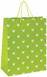 Изготовлен из ламинированной мелованной бумаги с веревочными ручками из полипропилена. Размер – 26x13x32 см. Пакет с принтом в виде галочек-сердечек выполнен в зеленом цвете.