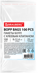 Пакеты фасовочные БОПП с клеевым клапаном BRAUBERG, 8х12 + 4 см, 25 мкм, 100 шт/уп