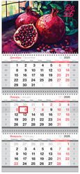 Квартальный календарь BG «Гранат» на 2026 год — помощник в планировании и украшение интерьера. Размер — 295*660 мм. Вертикальный календарь включает три блока, каждый из которых содержит 12 листов. Блоки держатся на трёх гребнях. Листы выполнены из офсетной белой бумаги плотностью 65 г/м² с использованием двухцветной печати. Подложка изготовлена из мелованного картона плотностью 320 г/м². Нижняя часть подложки напечатана в один цвет, а верхняя — полноцветная.