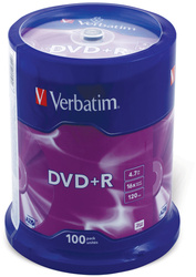 DVD+R диски в тубе VERBATIM, 100 штук, 16х, 4,7 Gb, Cake Box