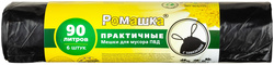 Пакеты для мусора ПВД РОМАШКА, 90 л, 75х85 см, 45 мкм, черные, 6 шт/рул, с завязками