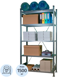 — Количество полок — 5 штук. Максимальная нагрузка на стеллаж — 1500 кг.