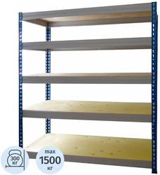 Максимальная нагрузка на стеллаж: 1500 кг. Тип покрытия стоек — порошковое, цвет стоек — синий, цвет полок — натуральное дерево. Внимание! Максимальное расстояние от пола до первой полки — не более 150 мм.