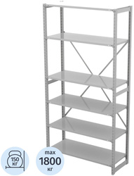 Стеллаж Универсал подойдет для размещения любых штучных грузов — коробок и ящиков, бытовой и офисной техники, упаковок продукции и документов. Будет служить вам на складе и офисе, в архиве, дома и на даче, в гараже и мастерской, в магазине и подсобных помещениях. Полностью без болтовое крепление не требует использования специальных инструментов и позволяет легко и быстро собрать стеллаж. Перфорация стоек позволяет переставлять полки с шагом 44 мм так, как это необходимо. Существует возможность установки множества дополнительных элементов для удобного хранения ваших вещей. Задний экран, вешало, перфорированные полки в комплект стеллажа не входят. Максимальная нагрузка на стеллаж 1800 кг. Максимальная распределенная нагрузка на полку 150 кг. Количество полок — 6 штук. Нет возможности увеличения высоты корпуса. Подпятник встроен в элемент фиксации рамы стеллажа. Может быть дополнен элементом для жесткой фиксации стеллажа к полу.