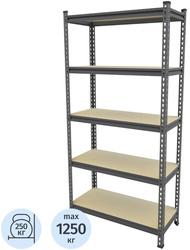 Стеллаж подходит для создания эффективной системы хранения в гараже и на складе, на даче, на балконе, лоджии, кладовой. Прочный каркас изготовлен из металла, полки — из ДСП. Конструкцией предусмотрена сборка без использования болтов. Это значительно экономит время и позволяет быстро установить стеллаж. Количество полок — 5 штук. Максимальная нагрузка на полку — 250 кг. Максимальная нагрузка на стеллаж — 1250 кг. Увеличение высоты корпуса, невозможно. Подпятники в комплекте, защищают поверхность пола от царапин, препятствуют скольжению.