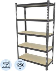 Стеллаж подходит для создания эффективной системы хранения в гараже и на складе, на даче, на балконе, лоджии, кладовой. Прочный каркас изготовлен из металла, полки — из ДСП. Конструкцией предусмотрена сборка без использования болтов. Это значительно экономит время и позволяет быстро установить стеллаж. Количество полок — 5 штук. Максимальная нагрузка на полку — 250 кг. Максимальная нагрузка на стеллаж — 1250 кг. Увеличение высоты корпуса, невозможно. Подпятники в комплекте, защищают поверхность пола от царапин, препятствуют скольжению.