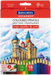 Карандаши цветные мягкие BRAUBERG АКАДЕМИЯ 18 цветов, шестигранные, натуральное дерево