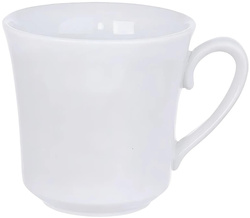 Кружка изготовлена на Дулевском фарфоровом заводе (г. Ликино-Дулево, Московская область) из классического твердого фарфора. Кружка белого цвета, с сероватым оттенком, без деколи. Имеет универсальную, круглую форму, с эргономичной ручкой. Край кружки заглазурован. Можно использовать как самостоятельно, так и с блюдцем.