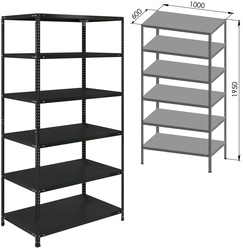 Стойка имеет разборную конструкцию, благодаря чему стеллаж поставляется в компактной упаковке. Максимальная нагрузка на полку при этом достигает 100 кг, на стеллаж - до 500 кг. Стойки с усиленным угловым профилем сложного сечения 30х30 мм и толщиной металла 1,2 мм. Полки имеют толщину основания 0,5 мм, усилены центральным ребром жесткости. Высота бокового и торцевого ребра полки - 33 мм, толщина - 1 мм. Для повышения жесткости всей конструкции верхняя и нижняя полка усилена дополнительными Г-образными уголками. Шаг установки полок - 25 мм. Опоры пластиковые, нерегулируемые. Вся необходимая фурнитура для сборки в комплекте.