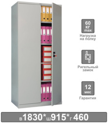 Вместимость шкафа не менее 60 папок «Корона» шириной 75 мм. В комплекте 4 полки, всего 5 уровней хранения. Максимальная нагрузка на полку - 60 кг.