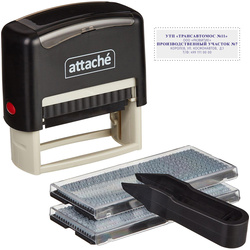 Штамп самонаборный Attache предназначен для самостоятельного создания и изменения текста оттиска. Компактный и надежный пластиковый корпус с автоматическим поворотным окрашивающим механизмом. На корпусе расположено информационное окно для корпоративной или личной персонализации. Легкая и чистая замена штемпельной подушки. Оптимальный набор букв, цифр и символов на двух ножках. Размер поля — 58×22 мм, 5 строк. Комплектация: штамп с рифленой пластиной для набора; две кассы букв: русские буквы, цифры, символы, 3 мм х 360 знаков; латинские буквы, цифры, символы, русские и латинские блок-сокращения, 4 мм х 312 знаков; синяя сменная штемпельная подушка, пинцет. Внимание! При использовании для набора текста широких символов (Ж, М, Ф, Ш, Щ, Ю, Ы), цифр, пробелов, а также при комбинации шрифтов 3 мм и 4 мм, данные по максимальной вместимости символов будут снижаться. Также символы рекомендуется размещать с отступом от края (внутрь) в случае использования разных шрифтов.