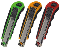 Ширина лезвия - 18 мм. 6 запасных лезвий внутри корпуса ножа. Автофиксация лезвия AUTO-LOCK. Резиновые вставки на рукоятке. Металлические направляющие. Цвет корпуса - ассорти. Упаковка - блистер.