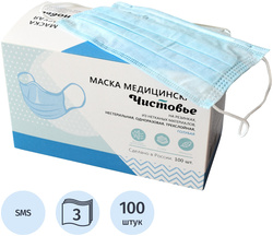 Маска медицинская одноразовая Чистовье трёхслойная голубая (100 штук в упаковке)