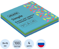 Стикеры Attache Simple Акварельная радуга в формате 76x76 мм, 4 цвета.Идеально подойдут для сотрудников творческих профессий и руководителей: рекомендуются для использования в процессе совещаний, обучения, мозговых штурмов. Тон стикеров - неоновый. Плотность бумаги составляет 62 г/кв.м, клейкий слой - 16 Н/м. В упаковке 100 листов, в блистере. Длина клейкой стороны 76 мм. После удаления бумаги на поверхности не остается следов клеевого состава, лист можно крепить повторно. Особых условий хранения не требует, сертификации не подлежит, срок годности не ограничен.Чтобы увеличить срок службы стикеров, пожалуйста, следуйте рекомендациям:1) Отделять стикер от блока следует вдоль клеевой полосы. Так можно избежать скручивания и последующего отклеивания стикера.2) Прежде чем наклеивать стикер, убедитесь в отсутствии грязи и пыли на поверхности. На чистой поверхности срок службы клеевого слоя более продолжителен.Законодательные и технические документы: