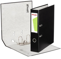 Папка-регистратор ’Комус’ из коллекции ’Экономи’ предназначена для хранения большого количества документов в одном месте. Формат А4. Изготовлена из плотного картона, покрытого бумвинилом черного цвета. Внутренняя вклейка бумажная. Арочный механизм произведен в Чехии. Нижние края папки защищены от повреждений металлическим кантом. На корешке шириной 75 мм есть карман со сменной этикеткой и кольцо для захвата. Благодаря прорезям для колец на внешней крышке папка-регистратор ’Комус’ остается закрытой даже при большом количестве бумаг. Папка вмещает до 480 листов.