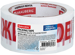 Упаковочная клейкая лента BRAUBERG, 45 мкм, 48 мм х 66 м, белая, надпись «ЖИДКОЕ!!!»