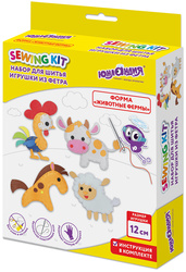 В набор для шитья входят: - Фетровые элементы, содержащие перфорацию по краям и предназначенные для сшивания 4 игрушек из фетра: петушок, корова, лошадка, овечка. - Элементы из самоклеящегося фетра, предназначенные для размещения на игрушке путем приклеивания; - Безопасная пластиковая игла; - Нитки мулине, предназначенные для сшивания элементов между собой (нить рекомендуется разделить на 2 более тонкие нити); - Наполнитель для набивки игрушки; - Подробная инструкция.