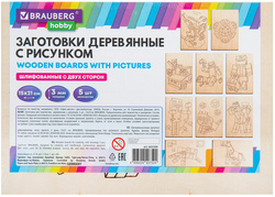 Заготовки деревянные для выжигания BRAUBERG HOBBY, Кубический мир, 5 шт., 10 рисунков, 15х21 см