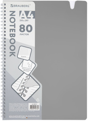Тетрадь на силиконовой спирали с пластиковой обложкой, вырубка для ручки BRAUBERG, А4, 80 листов, клетка, серый