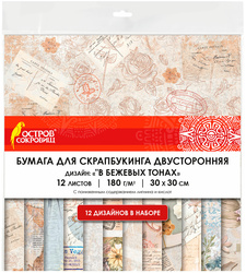 Бумага для скрапбукинга ОСТРОВ СОКРОВИЩ, 30х30 см, В бежевых тонах, двусторонняя, 12 листов, 180 г/м2
