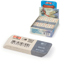 Ластик сделан из натурального каучука и обеспечит лёгкое и чистое стирание без повреждения поверхности бумаги и без образования бумажной пыли. Поставляется в прямоугольной форме со скошенными краями, позволяющими стирать даже тонкие линии. Ластик разделен на две части: белая стирает надписи, сделанные чернографитным карандашом, серая - чернила. Размер - 57х19,5х8 мм.