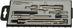 - Состоит из 7 предметов: циркуль стальной, кронциркуль, пенал с запасным грифелем, игольная вставка,металлический рейсфедер, удлинитель, держатель