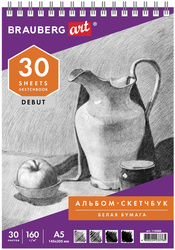 Скетчбук белая бумага BRAUBERG ART DEBUT, 30 листов, 145х205 мм, 160 г/м2, гребень, жёсткая подложка