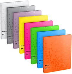 Папка на 4 D-кольцах Berlingo - ассорти из серий Neon, Metallic, DoubleWhite формата А4 – стильный аксессуар для офиса и учёбы. Изготовлена из высококачественного полипропилена с матовой текстурой поверхности «рельефные треугольники», на которой не видно отпечатков пальцев и мелких царапин. Толщина обложки – 1000 мкм. Ширина корешка составляет 24 мм. Стильные черные кольца и фурнитура. Специальная D-форма колец диаметром 20 мм помогает удобно и ровно хранить документы, которые могут быть выровнены по левому краю, благодаря боковой вертикальной стенке кольца. Вместимость папки – 150 листов. На внутренней стороне обложки папка оснащена плотным прозрачным карманом для удобного хранения мелочей: ручки, заметок, визиток, дисков, флешек и др. Размер папки составляет 31025024 мм. Упакована в индивидуальный прозрачный пакет по форме.