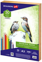 Бумага для рисования и графики BRAUBERG ART, 50 листов, А3, ватман ГОЗНАК, 200 г/м2, в коробке