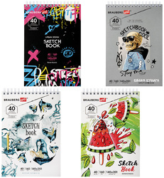 Изделие имеет размер 140х201 мм и содержит 40 белоснежных листов плотностью 160 г/м2 с гладкой текстурой. Листы удобно скреплены спиралью, что позволяет переворачивать их на 180 градусов. Скетчбук представлен в четырех разных дизайнах, среди которых каждый найдет что-то по вкусу. Жесткая задняя подложка позволяет делать зарисовки и наброски на весу. Бумага не "съедает" цвет, оставляя яркие цвета неизменными.
