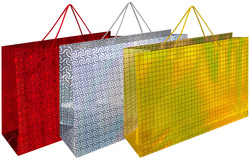 Голографический пакет изготовлен из мелованной бумаги с веревочными ручками из полипропилена и представлен в трех цветах и дизайнах. Выполнен в красном, золотистом и серебристом цветах. Размер – 62x17x42 см.