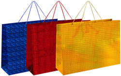 Голографический пакет изготовлен из мелованной бумаги с веревочными ручками из полипропилена и представлен в трех цветах и дизайнах. Выполнен в красном, золотистом и синем цветах. Размер – 70x16x50 см.