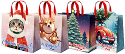 Подарочный новогодний пакет изготовлен из ламинированного мелованного картона, снабжен ленточными ручками из полиэстера. Размер – 26х13х32 см. На пакетах изображены иллюстрации в новогодней тематике и поздравительные надписи (4 дизайна ассорти без возможности выбора), которые точно вызовут улыбку. К некоторым деталям иллюстрации добавлен 3D-эффект.