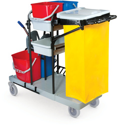 Комплектация: - Ведра 2х20 л, 2х11 л; - 2 поддона: - 2 лотка; - Защитные диски на колесах; - Держатели для МОПов и швабр; - Держатель для мешка; - Корзина для бытовой химии; - Мешок многоразового использования; - Платформа; - Поддон; - Транспортная ручка.