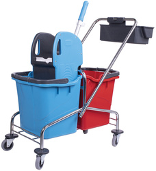 Представляет собой металлическую платформу на колесах с ведрами объемом 25 л каждое, механическим отжимом и корзинкой для бытовой химии на ручке. Корпус платформы изготовлен из хромированного металла, а инвентарь - из пластика. Тележка выполнена в трехцветном исполнении: красный, синий и серый. Колеса позволяют перемещаться в произвольном направлении.