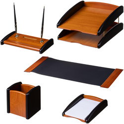 Комплектация: коврик настольный (дерево, ПВХ), подставка-держатель для ручек (МДФ, металл, пластик), подставка для бумаг для заметок (МДФ), подставка для ручек и карандашей (МДФ), лоток для бумаг двухъярусный (МДФ, металл), ручка шариковая (2 штуки).