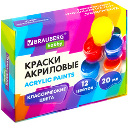 Краски акриловые BRAUBERG HOBBY, набор 12 цветов, 20 мл
