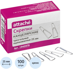 Скрепки канцелярские 25 мм Attache металлические оцинкованные (100 штук в упаковке) — незаменимый атрибут работы с документами и бумагами в офисе, дома, на учебе. Эти изделия предназначены для скрепления нескольких листов любого формата воедино, с возможностью их разъединения при необходимости. Скрепки Attache сделают хранение и перенос нескольких бумаг более удобными и внесут порядок в ваше рабочее пространство. Скрепки треугольной формы имеют металлическое покрытие (цинк), цвет у изделий серебристый — классика для деловой атмосферы. Упаковка включает 100 сгибаемых, негофрированных скрепок. Длина одной скрепки равняется 25 миллиметрам. Страна происхождения — Китай.