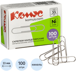 Скрепки КОМУС никелированные, 33 мм, 100 шт/упак