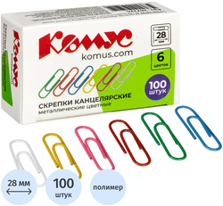 Скрепки КОМУС с полимерным покрытием, 28 мм, ассорти, 100 шт/упак