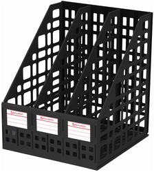 Выполнен в черном цвете с тремя отделениями. Предназначен для хранения каталогов и папок. Представляет собой прочную устойчивую сборную конструкцию с сетчатыми боковыми стенками. Размеры: высота - 295 мм, ширина - 240 мм, глубина - 250 мм.