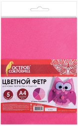 Цветной фетр, мягкий ОСТРОВ СОКРОВИЩ, А4, 2 мм, 5 листов, 5 цветов, плотность 170 г/м2, оттенки розового
