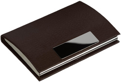 Визитница карманная на 20 визиток металлическая обтянута коричневой экокожей. Имеет хромированный шильд для гравировки. Используется для хранения визитных, банковских, дисконтных карточек.