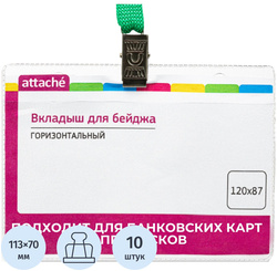 Бейдж Attache горизонтальный изготовлен из высококачественной импортной пленки ПВХ с прозрачной фактурной антибликовой поверхностью плотностью 180 мкм. Имеет одно овальное и два круглых отверствия. Размер бейджа по наружному шву 120×87 мм, размер вставки 113×70 мм. Для крепления используется клипса с лентой зелёного цвета. Ширина ленты 10 мм, длина 800 мм.