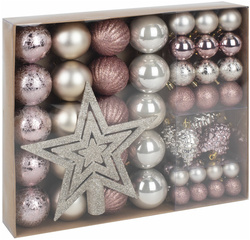 В комплекте: 3 шт. украшения в форме шишки кремово-серебристого цвета (6,5 см); 3 шт. украшения в форме шишки розово-золотистого цвета (6,5 см); 1 шт. украшение в форме пятиконечной звезды кремово-серебристого цвета с блёстками (20 см); 5 шт. глянцевых шаров розово-золотистого цвета (6 см); 5 шт. шаров кремово-золотистого цвета c жемчужным оттенком (6 см); 5 шт. матовых шаров кремово-золотистого цвета (6 см); 5 шт. шаров розово-золотистого цвета (6 см); 3 шт. шаров розово-золотистого цвета (4 см); 3 шт. глянцевых шара розово-золотистого цвета (4 см); 3 шт. шара розово-золотистого цвета с блёстками (4 см); 3 шт. матовых шара кремово-золотистого цвета (4 см); 4 шт. глянцевых шара розово-золотистого цвета (3 см); 4 шт. матовых шара кремово-золотистого цвета (3 см); 4 шт. пластиковых шара розово-золотистого цвета с блёстками (3 см); 4 шт. пластиковых глянцевых шара кремового-золотистого цвета (3 см); нитки из полиэстера для подвешивания шаров золотистого цвета 27 шт. длиной 30 см каждая.