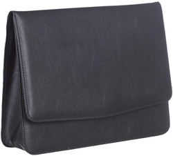 Объемная папка из искусственной кожи черного цвета с клапаном на кнопке. Дополнительно имеются карманы для визиток и ручки.